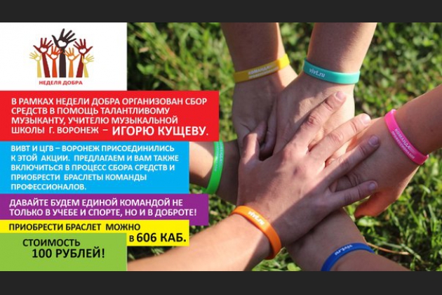 ВИВТ и ЦГВ-Воронеж присоединились к данной акции. В результате было собрано более 7000 рублей. Все собранные средства будут направлены на реабилитационные мероприятия по восстановлению Игоря Кущева после операции.